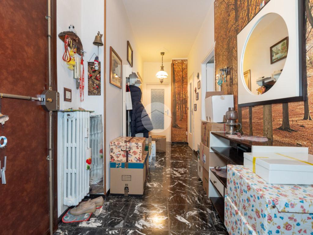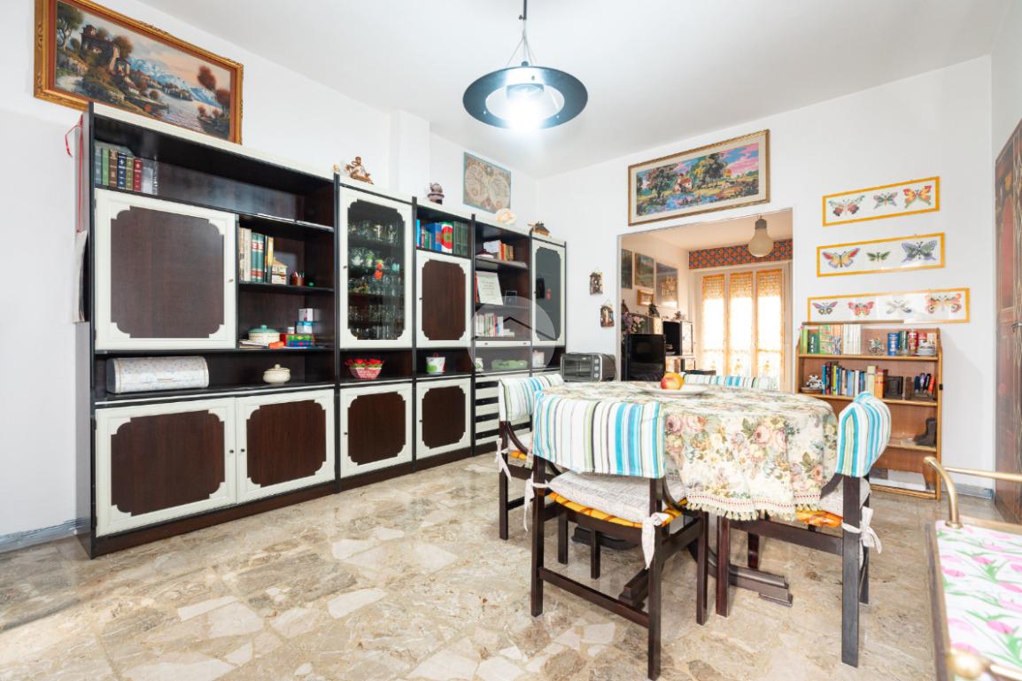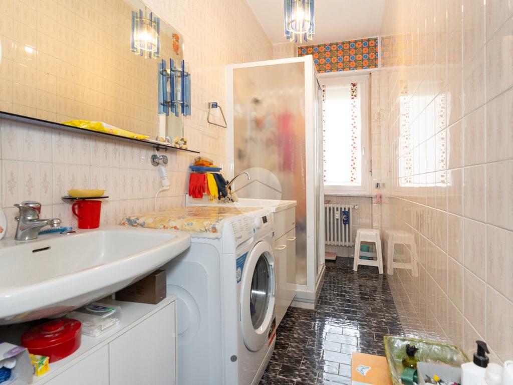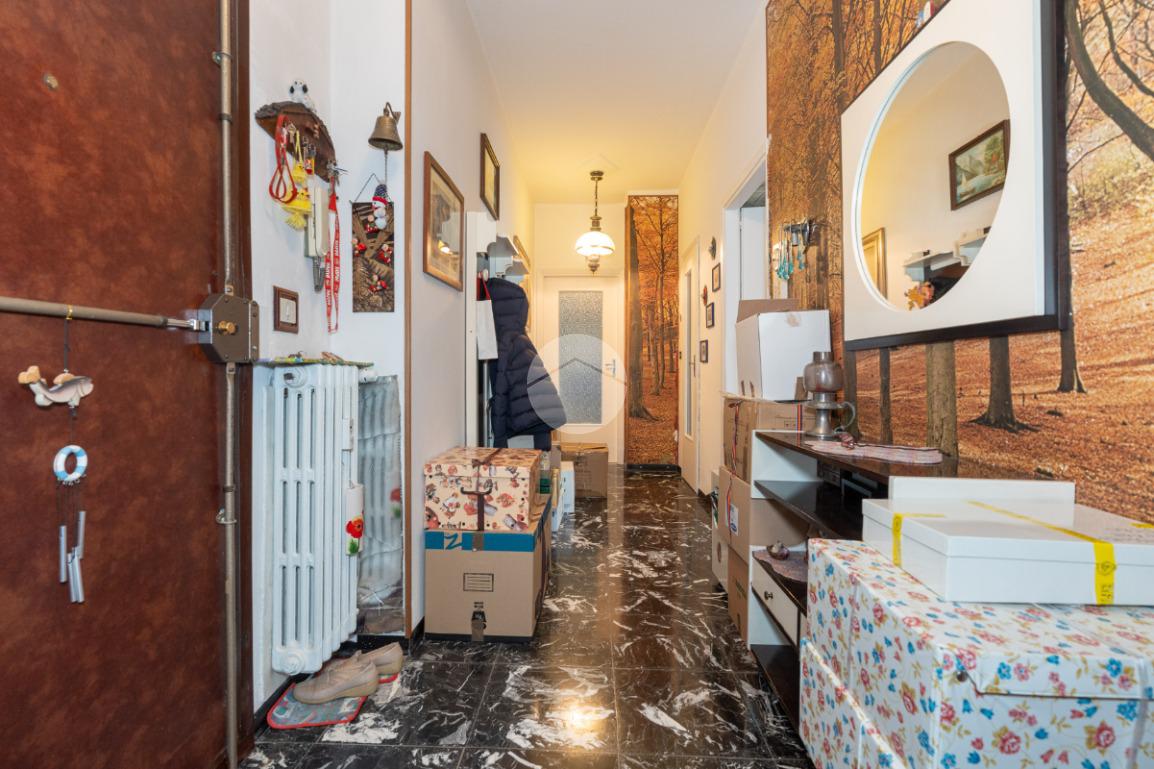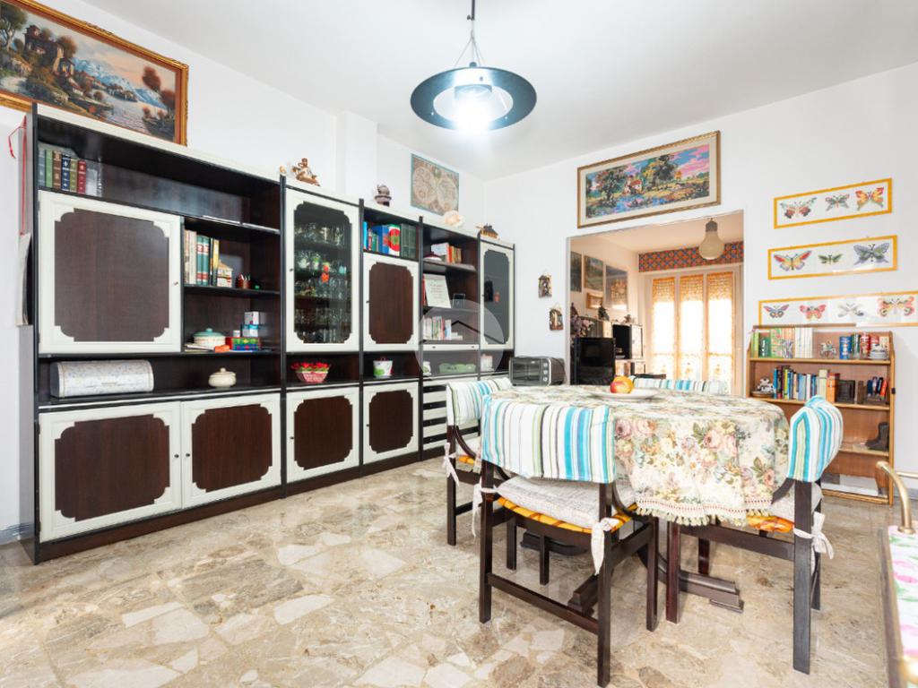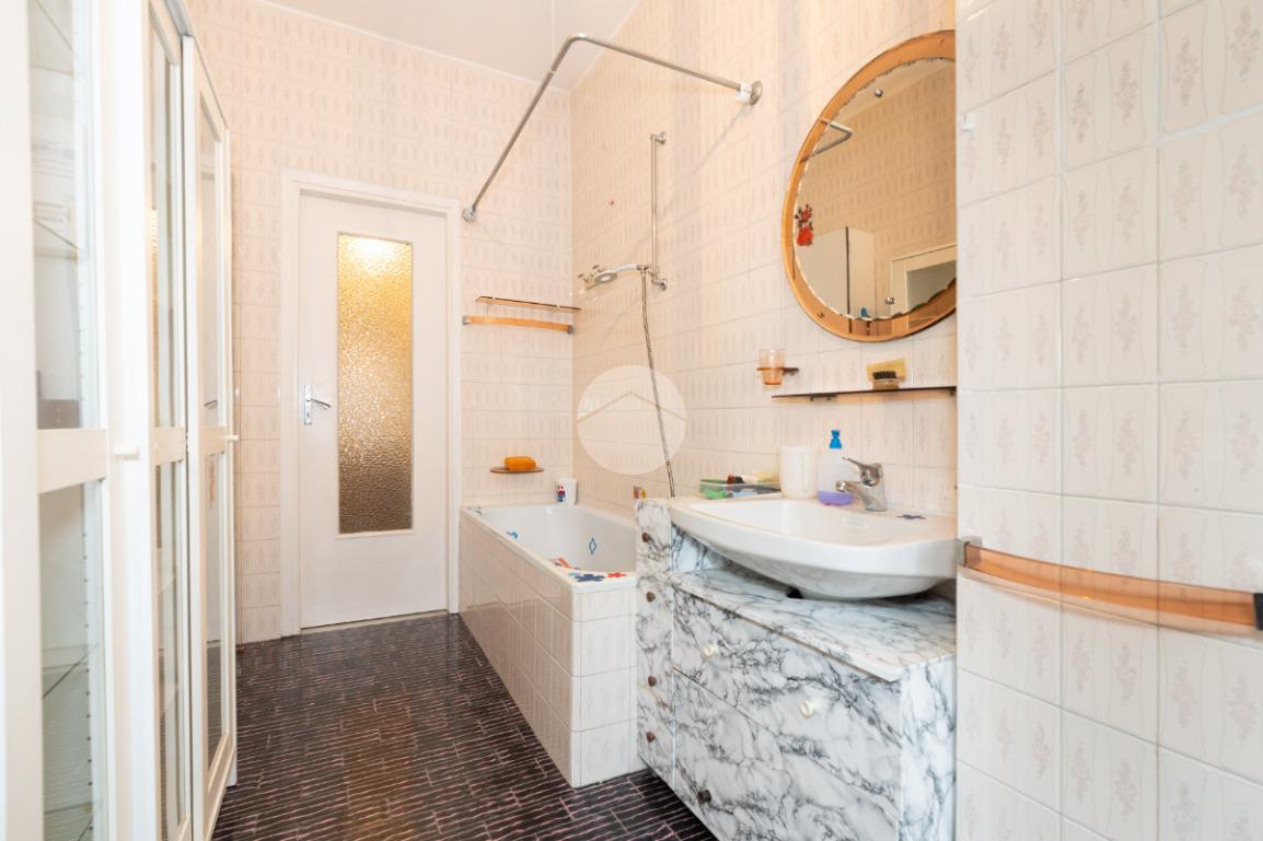 L’alloggio si trova al primo piano di uno stabile degli anni ’60 dotato però di ascensore. La palazzina si trova in una via centrale del paese, quindi comoda a tutti i servizi offerti da quest’ultimo, ma in un contesto tranquillo e residenziale. La porta di ingresso si apre su un lungo corridoio che collega tutti gli ambienti della casa. La zona giorno è attualmente composta da cucinotto con sala da pranzo e soggiorno. All’interno della sala da pranzo è presente un ampio ripostiglio sfruttabile anche come dispensa. Da questo ambiente si accede ad un piccolo balcone verandato. La zona notte è invece composta da due ampie camere matrimoniali e sono presenti anche i doppi servizi, uno dei quali adibito parzialmente a lavanderia. Il salotto ed una delle due camere da letto presentano un balcone vivibile che affaccia su strada. Completano la proprietà il box auto singolo a livello strada e la cantina. L’immobile si presenta in stato originale, ad eccezione degli infissi che sono stati sostituiti di recente, il che garantisce di personalizzare questo appartamento in base ai propri gusti ed esigenze sfruttando l’ampia metratura che lo caratterizza.