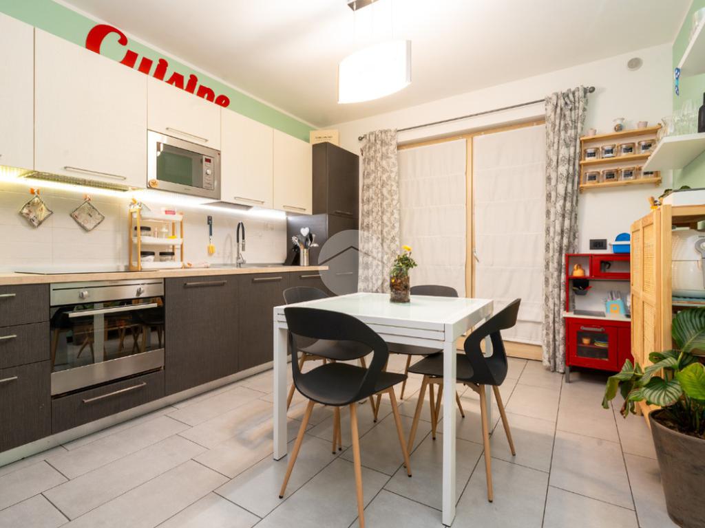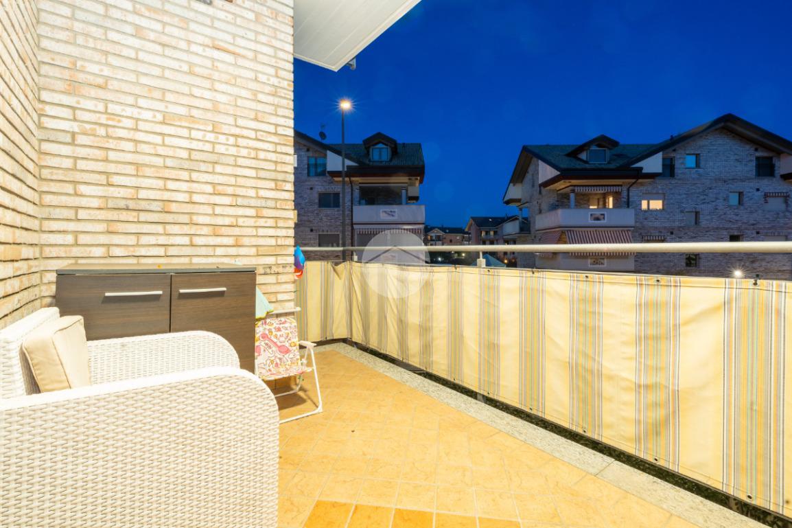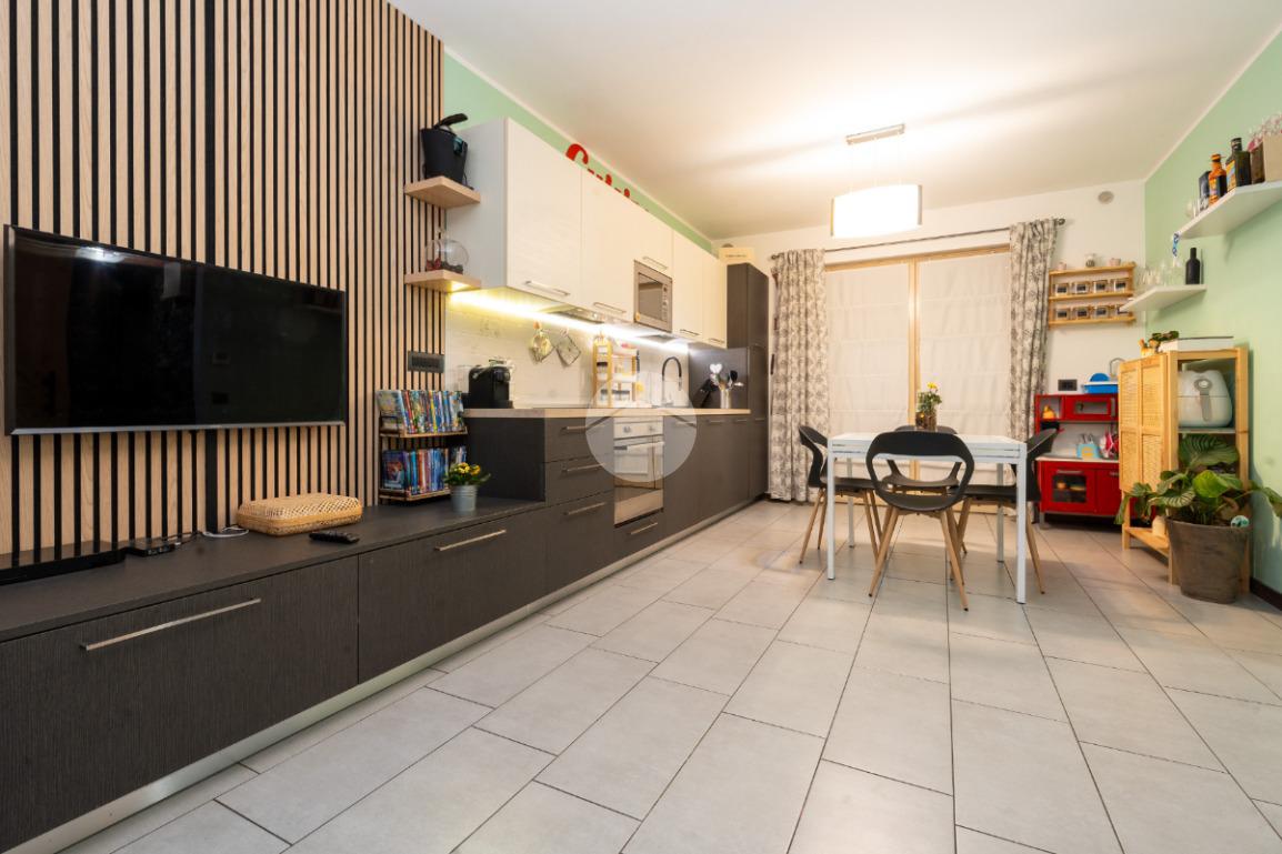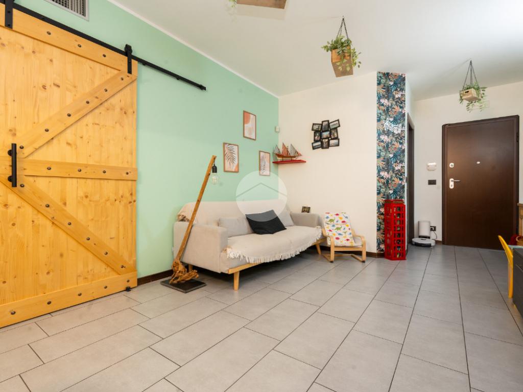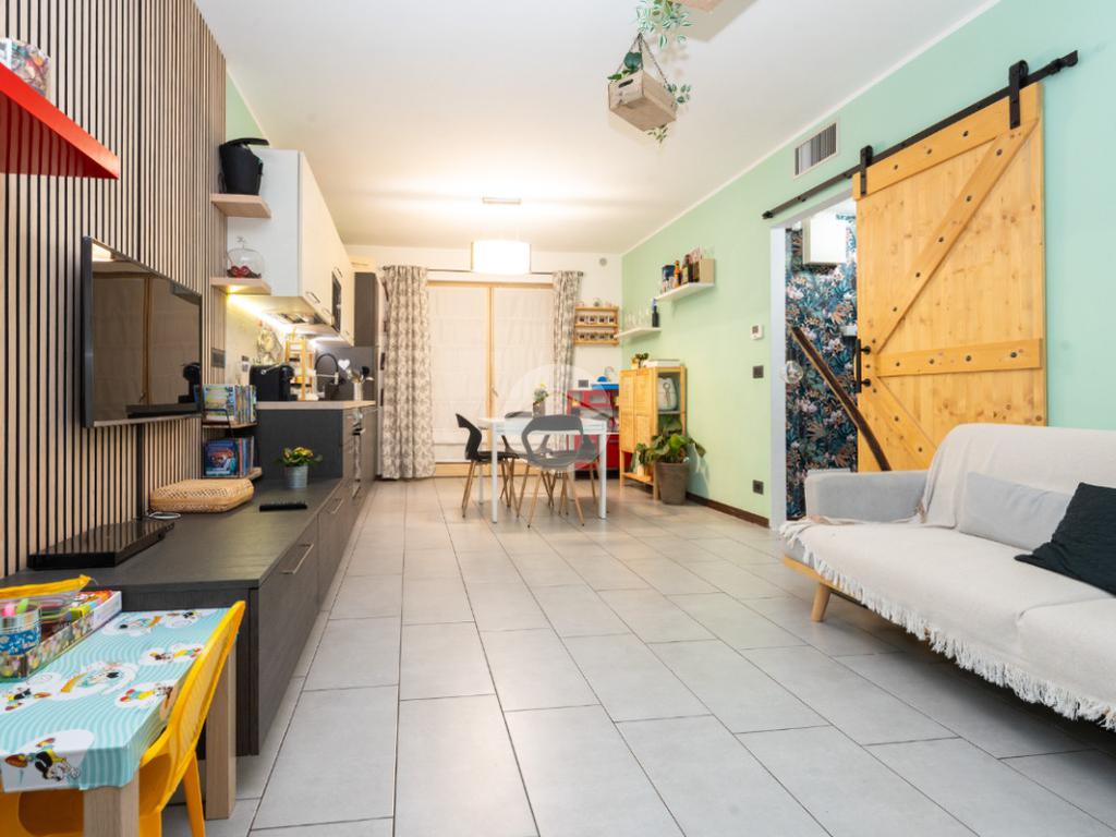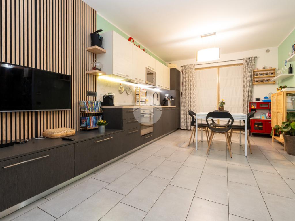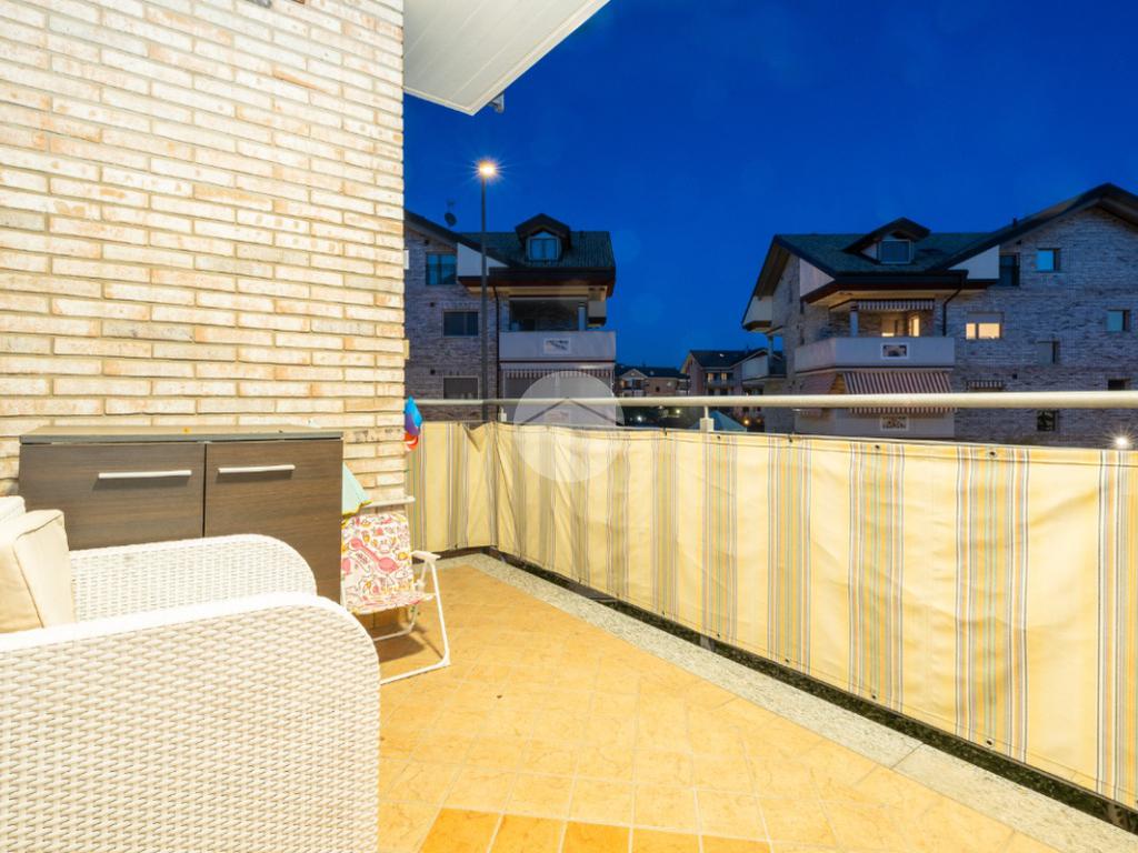 L’alloggio si trova al primo piano di una palazzina di recente costruzione dotata di ascensore e sita in una zona residenziale del paese, lontana dal caos cittadino. Il portoncino blindato da accesso all’ampia zona giorno composta dalla zona relax con divano e parete attrezzata per la tv e dalla cucina lineare ed un tavolo con quattro sedie. Da questo ambiente si accede al terrazzo verandato di generose dimensioni ideale da sfruttare nelle belle giornate di sole. Il disimpegno conduce alla zona notte composta da due camere da letto, di cui un con balcone ampio. Il bagno è finestrato e presenta la doccia. Completa il piano abitativo uno spazioso ripostiglio situato all’ingresso. Il riscaldamento è a pavimento. La cantina ed il box auto singolo completano la proprietà. Questo immobile è ideale per chi cerca un contesto tranquillo, fuori dalla rotta aerea, usufruendo di tutte le potenzialità tipiche delle recenti costruzioni.